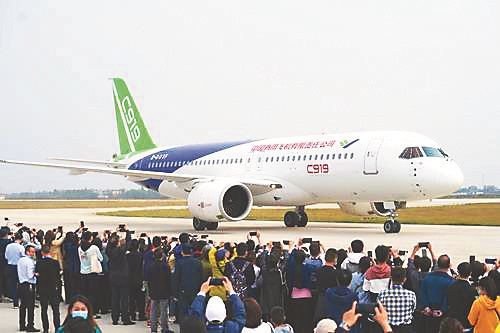 哈飛承擔(dān)了C919大飛機(jī)機(jī)身復(fù)合材料部件的制造。我省民營企業(yè)廣聯(lián)航空工業(yè)股份有限公司也提供了上百個零部件的工裝和裝配夾具,是C919復(fù)合材料成型工裝的主要供應(yīng)商。 C919大飛機(jī)。
