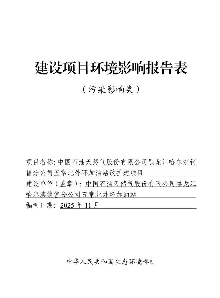 中國石油天然氣股份有限公司黑龍江哈爾濱銷售分公司五常北外環(huán)加油站改擴建項目環(huán)境影響報告表